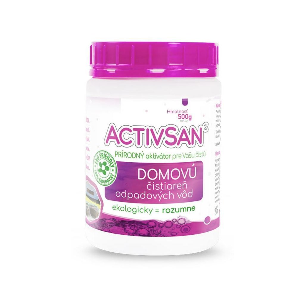Activsan ČOV 500g je prípravok určený k rozkladu zvyškových organických nečistôt v domovej čistiarni odpadových vôd. Optimalizuje chod domovej čističky odpadových vôd tým, že odstraňuje zvyškový kal a usadeniny, a tak zaisťuje bezporuchový chod čistiarne odpadových vôd, predchádza upchávaniu potrubia a zamedzuje tvorbe nepríjemného zápachu. Po jeho použití dochádza k rozkladu organických zvyškov v domovej čističke odpadových vôd na tekutinu bez zápachu. Výrobok je dôležitý tam, kde má domáca čistička odpadových vôd preplnenú kapacitu prísunu odpadových vôd z domu.