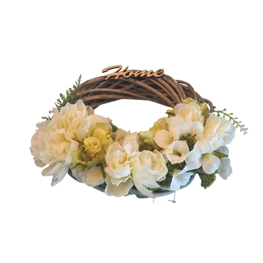 Prútený veniec Home v bielo-žltom prevedení zdobený umelými kvetmi bielej a žltej farby s dekoračnými ozdobami. Pekný dekoračný doplnok do interiéru, ale aj exteriéru.