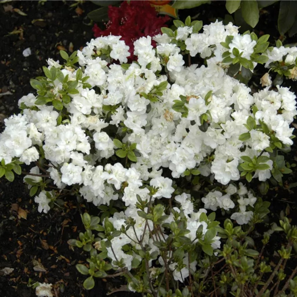 Najväčšou ozdobou sú plné, „tuplované“ kvety čisto bielej farby, ktoré sú doširoka otvorené av plnej sile dosahujú veľkosť približne 5–6 cm. Kvitne bohato v máji, často tak intenzívne, že kvety takmer úplne zakryjú listy. Čistá biela farba veľmi pekne vyniká v kombinácii s tmavozeleným ihličím, farebnými vresmi alebo tmavšími azalkami a rododendronmi.