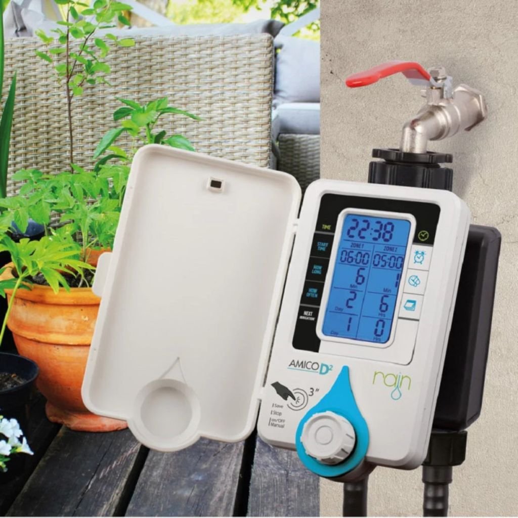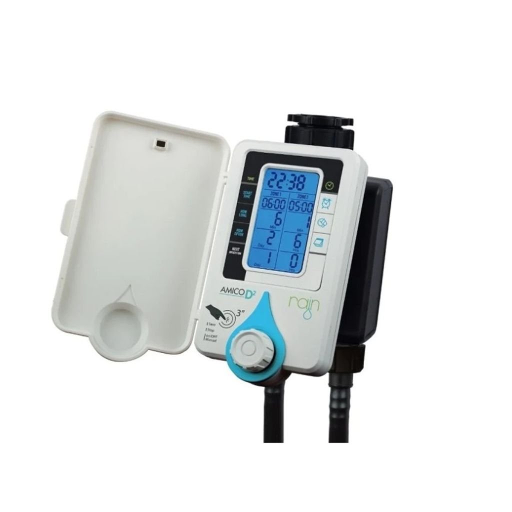 Riadiaca jednotka RAIN AMICO D2 je ideálna na zavlažovanie terás a obytných záhrad. Má jednoduché programovanie - 3 jednoduché kroky, ktoré zabezpečujú ovládaciemu koliesku upravovať a zadávať údaje. Obsahuje veľkú podsvietenú obrazovku, ktorá zobrazuje uložené programy a zostávajúci čas do ďalšieho zavlažovania. Materiál tela je ABS Veľký podsvietený 3" LCD displej chránený krytom z tvrdého plastu. Napájanie: 2 x 1,5 V alkalické AA batérie (nie sú súčasťou balenia).