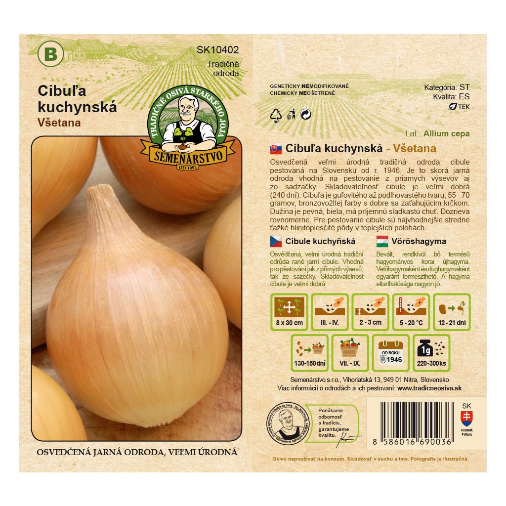 Osvedčená veľmi úrodná tradičná odroda cibule pestovaná na Slovensku. Je to skorá jarná odroda vhodná na pestovanie z priamych výsevov aj zo sadzačky. Skladovateľnosť cibule je veľmi dobrá. Cibuľa je guľovitého až podlhovastého tvaru do 70 gramov, bronzovožltej farby s dobre sa zaťahujúcim krčkom. Dužina je pevná, biela, má príjemnú sladkastú chuť. Dozrieva rovnomerne. Pre pestovanie cibule sú najvhodnejšie stredné ťažké hlinitopiesčité pôdy v teplejších polohách.
