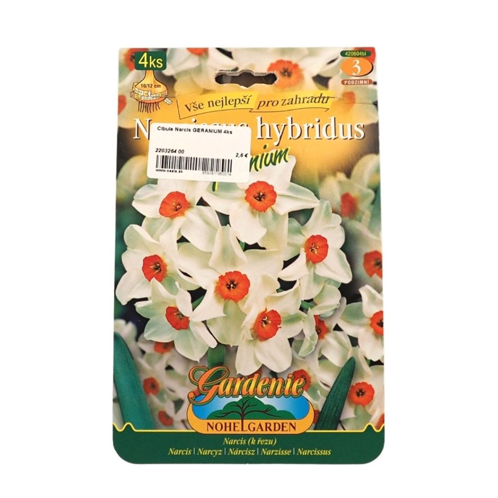 Narcis s botanickým názvom 'Geranium' vyniká snehobielou farbou a oranžovým terčom. Kvitne v III. - IV. a dorastá do výšky až 50 cm. Ide o nenáročné rastliny, vhodné aj pre začiatočníkov. Vyniknú v skupinových výsadbách, no v poslednej dobe sú moderné aj v jarných aranžmánoch a črepníkových výsadbách. Cibuľky sadíme na jeseň (IX. - XI.) do hĺbky 15 cm a 15 cm od seba. Volíme slnečné stanovište a stredne ťažké priepustné pôdy. Narcisy môžeme ponechať na pôvodnom stanovišti niekoľko rokov bez nutnosti vyberania cibúľ po odkvitnutí a zatiahnutí listov.Dodatočné parametre