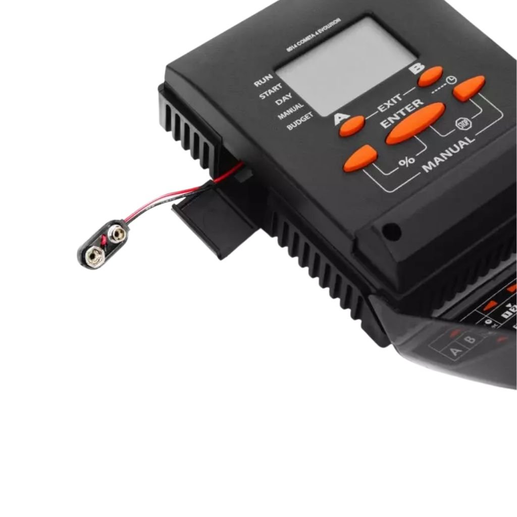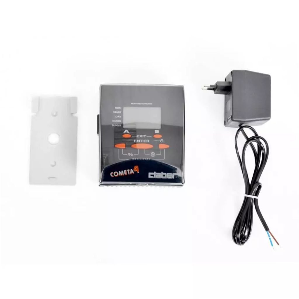 Cometa - kvalitná, prepracovaná 4-zónová riadiaca jednotka od firmy Claber. Toto unikátne zariadenie na ovládanie a kontrolu zavlažovacích systémov je vybavené veľkým a jasným displejom, ktorý Vám umožní jednoduché čítanie a zistenie potrebných informácií. Systém je jednoducho ovládateľný pomocou 3 spodných tlačidiel na zariadení. Ďalšie 2 tlačidlá Vám umožnia výber jedného z dvoch Vašich, či jedného z prednastavených programov.