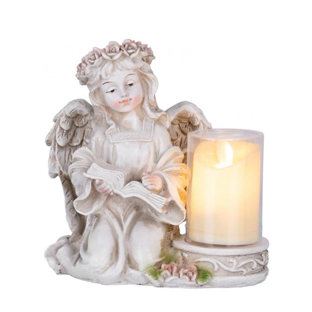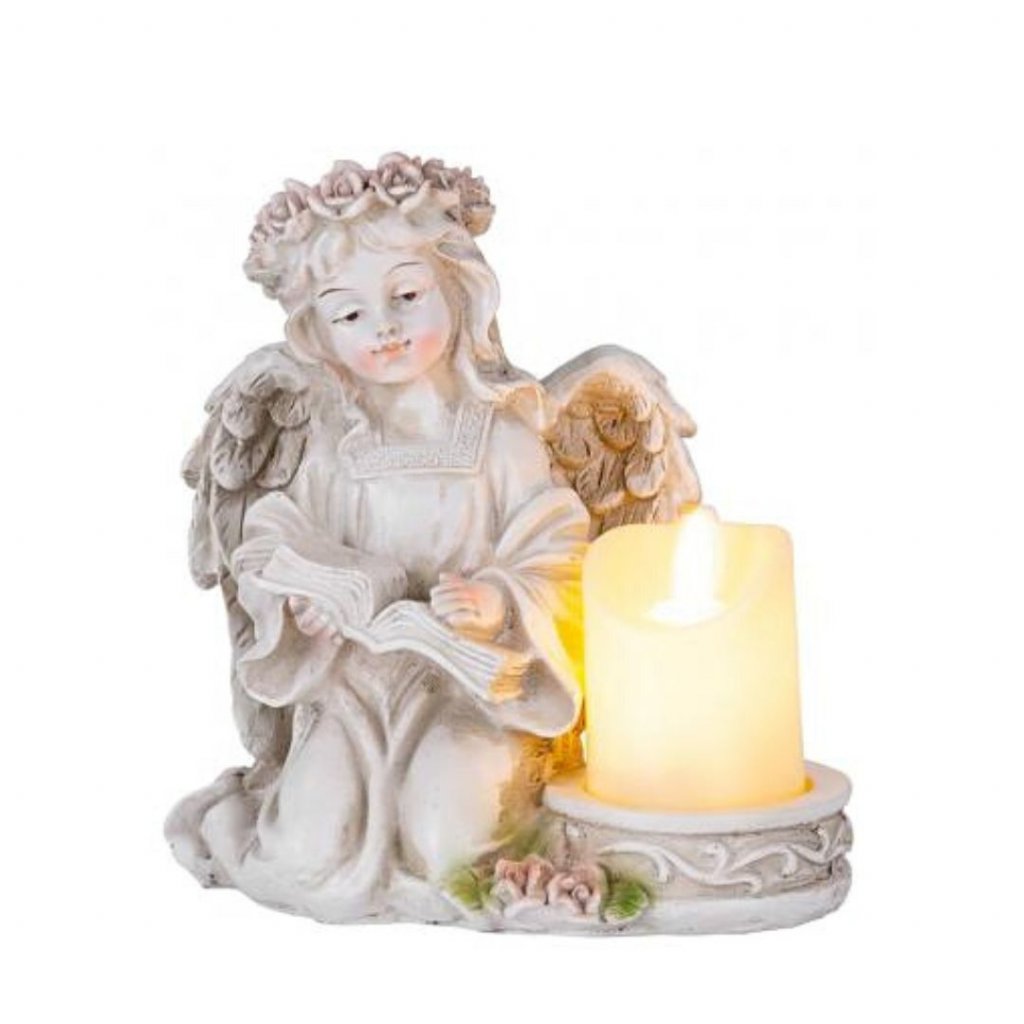 Dekorácia Anjel s knihou a sviečkou, LED, polyresin, na hrob, 17,5x14,5x17,5cm MagicHome
