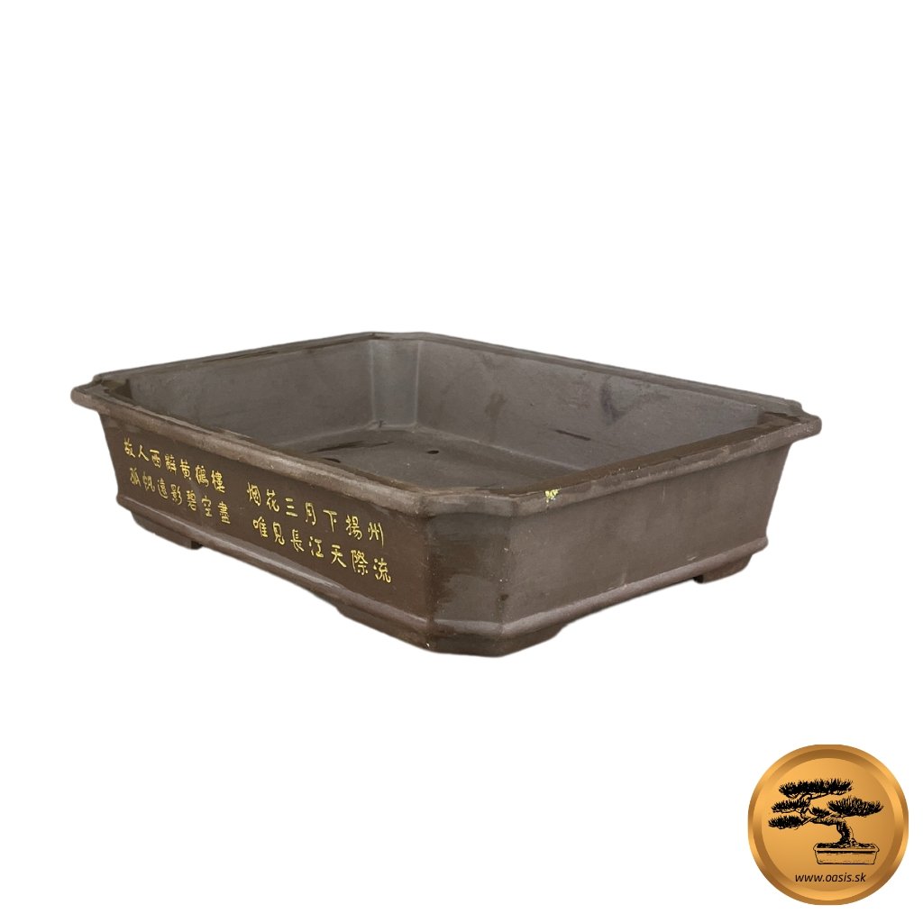 Keramická štýlová miska v hnedom prevedení, ktorá má po bokoch zlaté čínské znaky. Rozmery misky sú 25x20x5,5cm. Dodajte vášmu bonsaju ten správny vzhľad.Dodatočné parametre