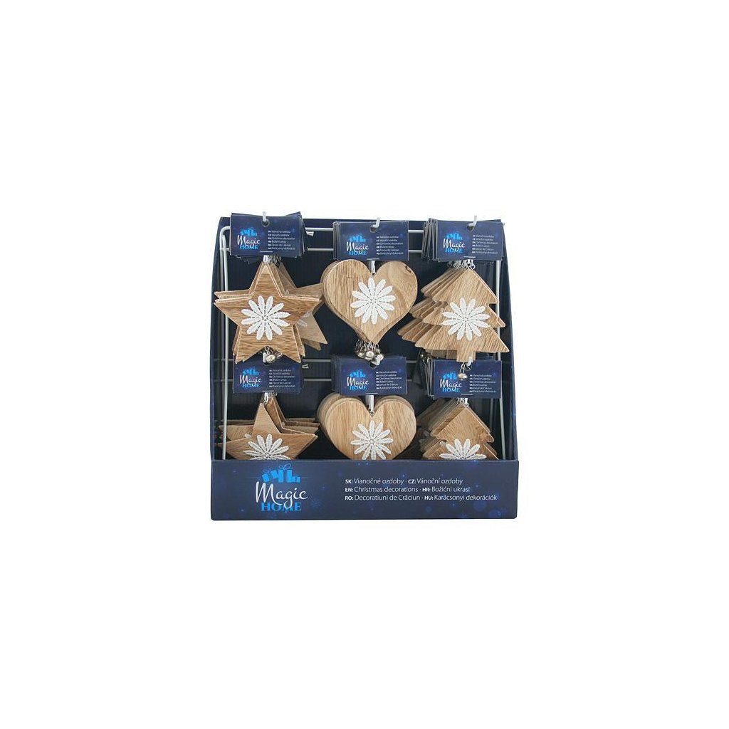 Ozdoba drevo, 3 druhy /hviezdička, stromček, srdce/, závesná, MagicHome