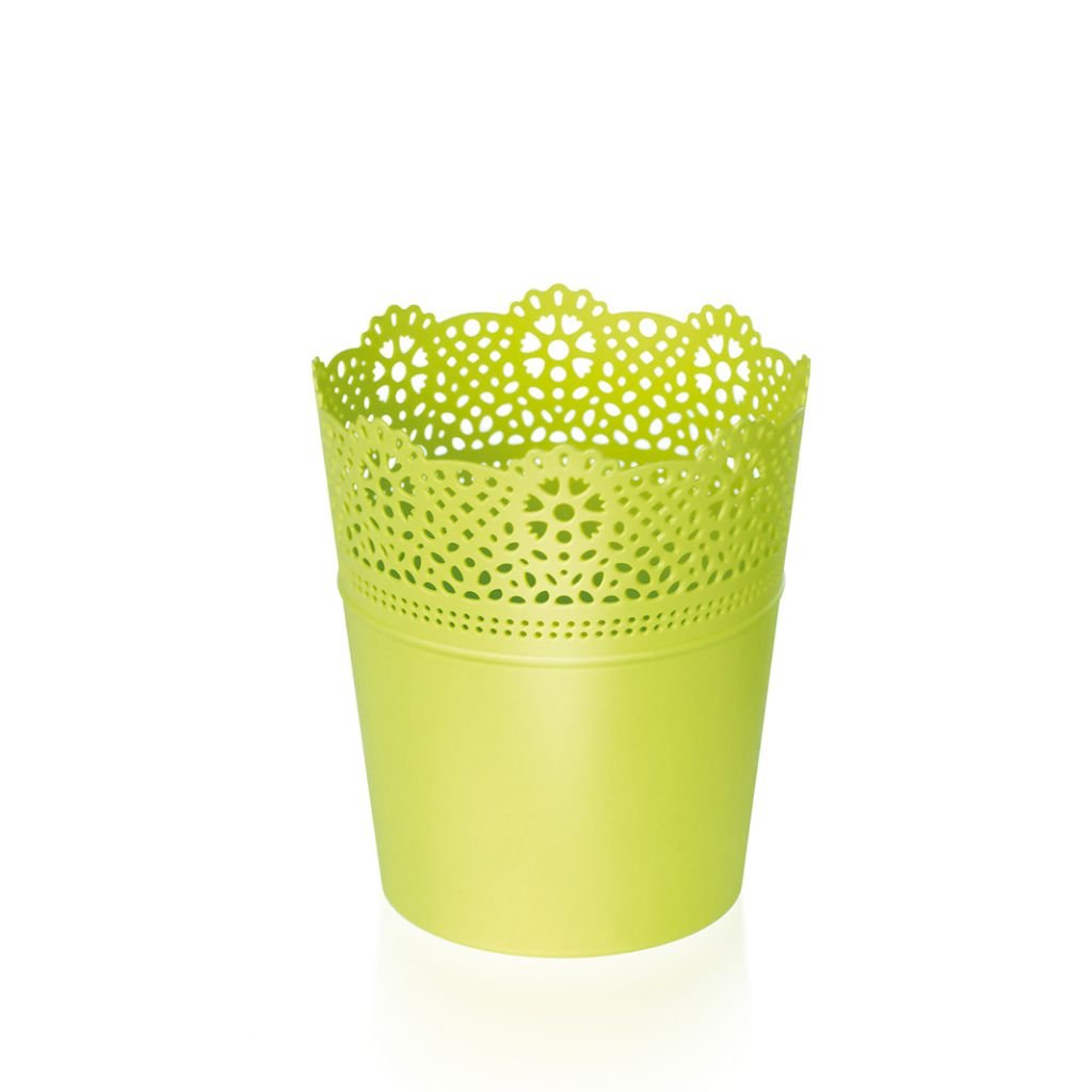Kvetináč má hladkú spodnú časť a v hornej časti krajkový vzor. Ľahký a odolný voči slnečnému žiareniu a má dlhú životnosť. Priemer 18 cm.Dodatočné parametre