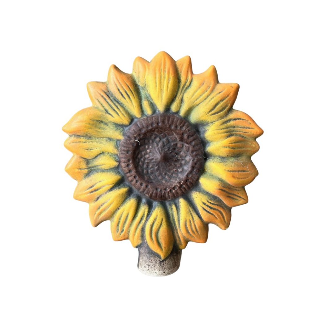 Česká ručná výroba. Solitérna keramická dekorácia v tvare slnečnice. Ručne maľovaná. Zo spodku má otvor na napichnutie na plot, palicu alebo tyč. Priemer 29 cm. Keramika je vhodná do exteriéru ale aj do interiéru.Dodatočné parametre