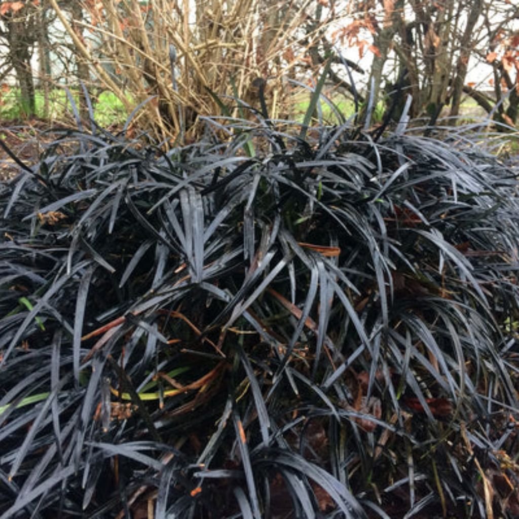 Ophiopogon planiscapus ‘Niger’, známy aj ako čierna tráva alebo čierny liriope, je atraktívna, vždyzelená rastlina s lesklými, úzkymi listami hlbokej čiernofialovej farby.