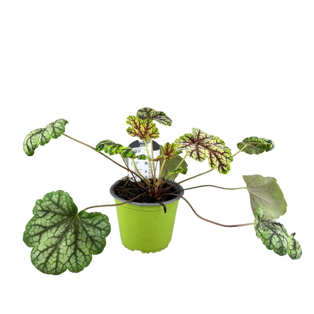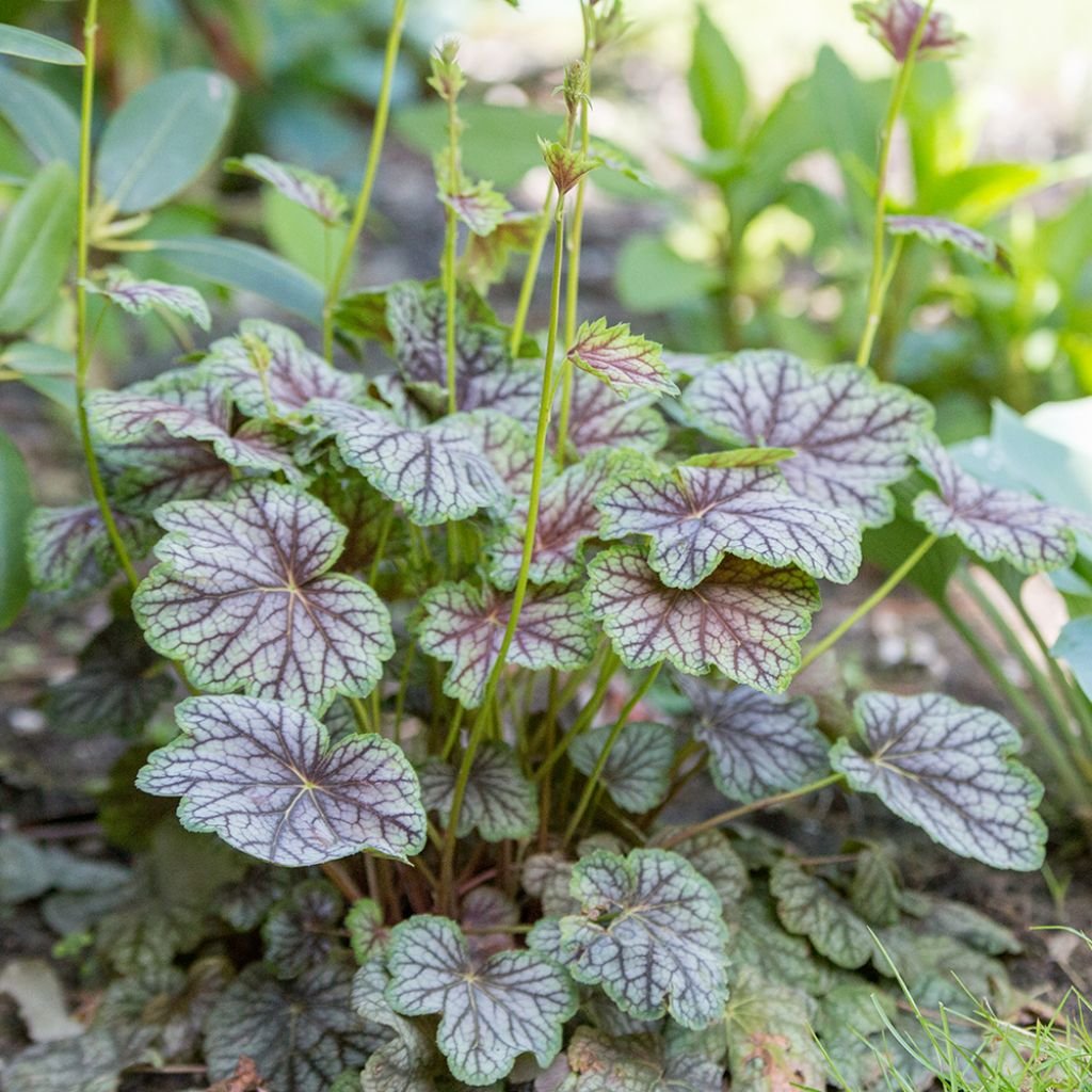 Striebornozelené lístie so sýto slivkovými znakmi okolo žiliek tvorí pekné, polovečne zelené kôpky, z ktorých sa objavujú drôtovité, rozvetvené stonky s malými bielymi kvetmi. Táto heuchera vyzerá nádherne vysadená v skupinách v prednej časti zmiešaného okraja alebo ju postavte na miesto, kde môžete najlepšie obdivovať jej nápadné listy.