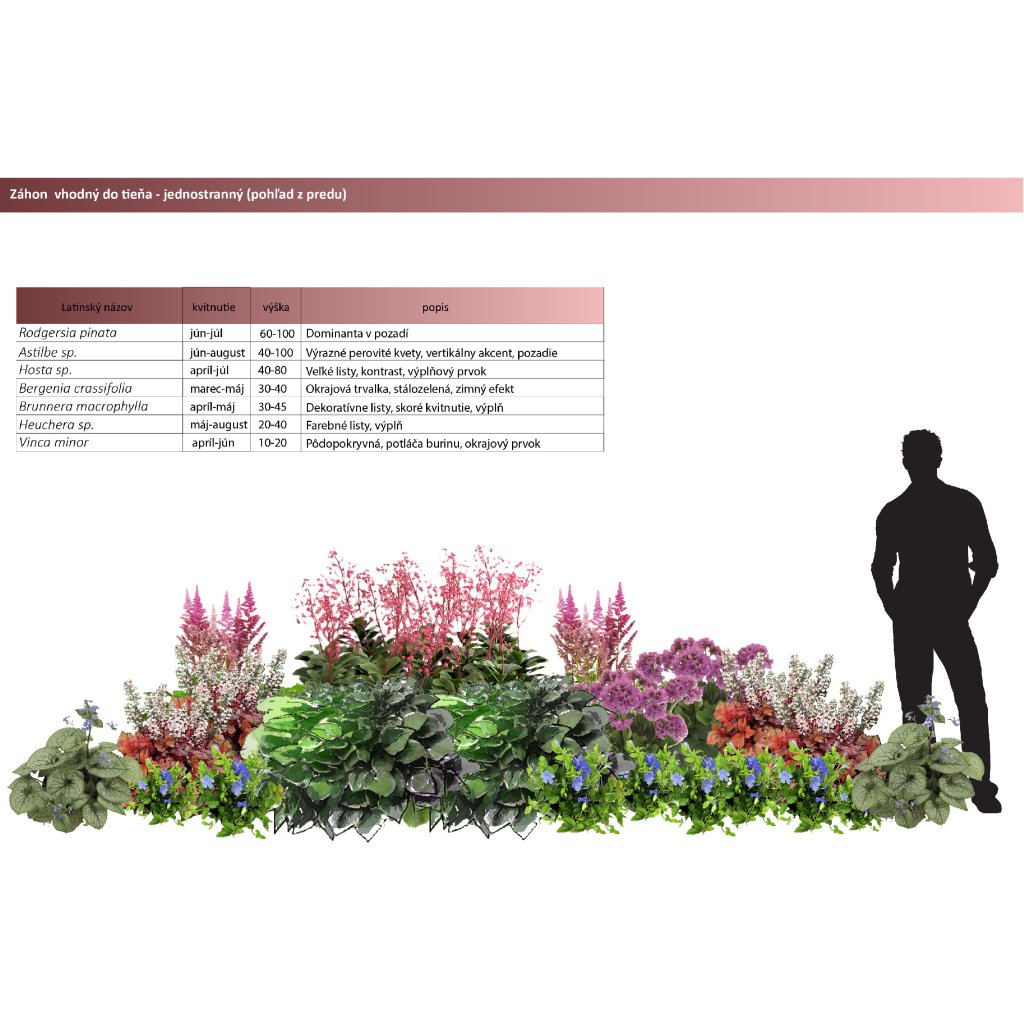 Predstavujeme vám náš kompletný záhon vhodný na tienisté stanovište. Záhon vyniká najmä textúrou listov, ale poteší vás aj kvetenstvo. Rozmer záhonu je 1,5x3m a je robený na pohľad z jednej strany (väčšie rastliny sú v pozadí a nižšie vpredu). Záhon kvitne postupne od mája do augusta.