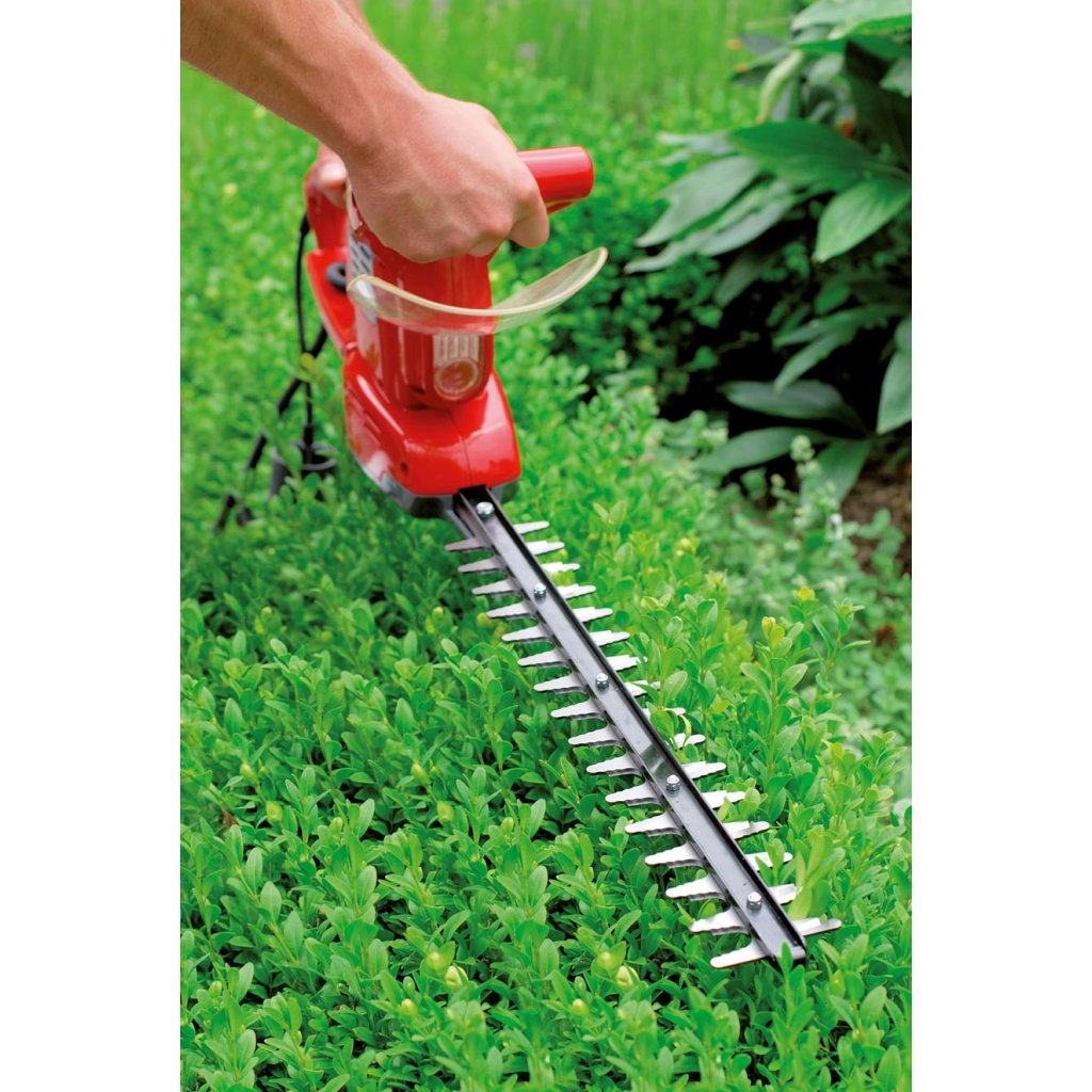 Nožnice sú s dĺžkou rezu 45 cm a so vzdialenosťou 22 mm medzi jednotlivými nožmi. Výkon motora je 230V/500 W. Využiteľné sú predovšetkým na profesionálne strihanie stredne veľkých živých plotov i s veľkými konármi. Otočná rezacia hlava až 180 st. s piatimi možnými polohami umožňuje ľahšiu manipuláciu pri strihaní všetkých veľkostí živých plotov. Dvojité diamantmi brúsené nože nepoškodzujú rastliny počas strihania, rez je presný a dokonalý. Bezpečnostný kryt chráni Vaše ruky pri práci s týmito nožnicami. Avšak veľmi dôležitým bezpečnostným prvkom je blokovací spúšťací systém. Uvedenie do pohybu nožov sa vykonáva dvoma spúšťacími mechanizmami nezávisle na sebe a to pre každú ruku samostatne. Hmotnosť elektrických nožníc je 3,6 kg. Pre dokonalú ochranu nožov počas uskladnenia slúži stabilné pevné puzdro, ktoré je súčasťou balenia. Dĺžka strihu: 45 cm Rozmery: - Rozpätie nožov: 22 mm Motor: 230 V / 500 W Váha: 3,6 kg Nôž / čepele: na oboch stranách, dvojité rotačné frézy s ochranou pri náraze Použitie: Strihanie živých plotov Extra: 180 st. otočná frézovacia hlava, dvojručné riadenie bezpečnosti, odľahčenie kábla, cutter, protiblokovací brzdový systémDodatočné parametre