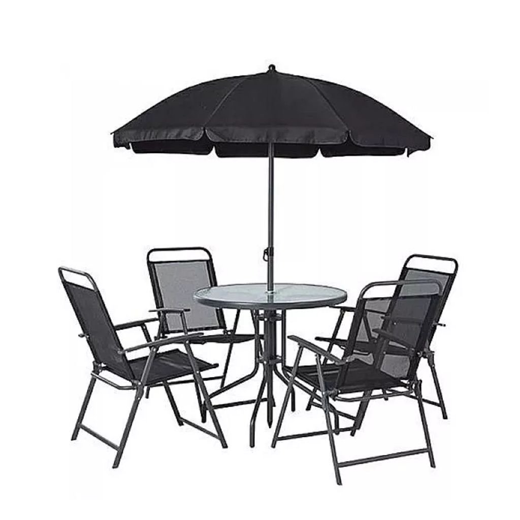 Záhradný set pozostáva zo štyroch stoličiek, stola a slnečníka. V strede stola je otvor, ktorý slúži priamo pre umiestnenie slnečníka. Tým, že bude slnečník umiestnení v strede stola, poskytuje možnosť naraz pokryť všetky stoličky umiestnené v okolí stola. Celý set je v tmavej farbe a jeho hlavné konštrukčné časti sú kvôli pevnosti a bezpečnosti vyrobené z kovu. Povrch slnečníka je pokrytý plátnom odolným voči vonkajším vplyvom a jeho priemer je 180 cm. Povrch stola je zasa vyrobený z tvrdeného skla a jeho rozmery sú 70 x 85 cm. Priemer kovu použitého na konštrukciu stola je 24 x 1 mm. Stoličky majú časť určenú na sedenie a opieranie pokrytú textilenovým plátnom, čím sú dostatočne pevné pre poskytnutie nosnosti až 120 kg. Priemer kovu, z ktorého sú vyrobené konštrukcie pre stoličky, je 22/18 x 1 mm. Ich rozmery sú 75 x 50 x 90 cm.